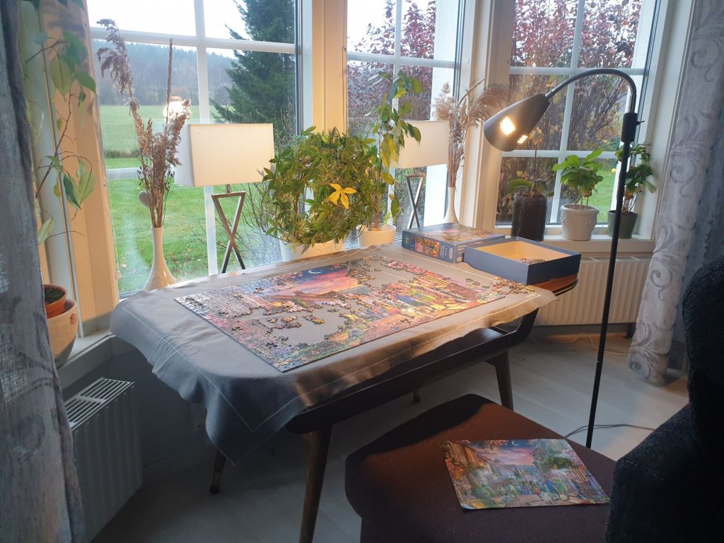Gillar att jag hade både en fri yta att inreda som min nya pusselhörna, ett bord som stått och väntat på att användas, och en riktigt skön pall att sitta på.