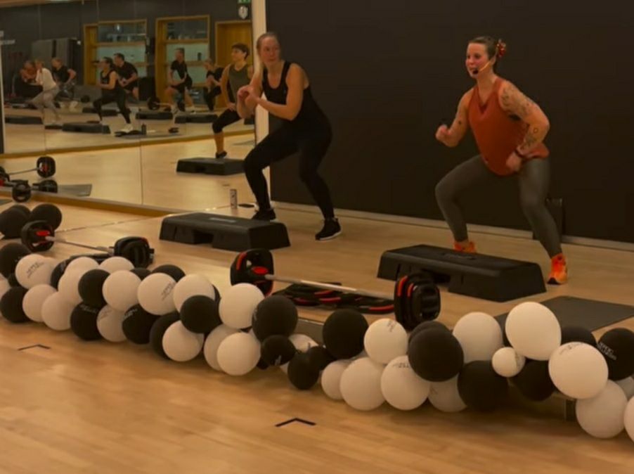 Jag går sällan på gymmets så kallade eventpass (specialpass som kombinerar 2-3 olika pass) och fastnar därmed sällan på bild när det filmas eller fotograferas under eller efter passen. Men jag ÄR faktiskt där då och då – och visst hittade jag för ett tag sedan ett eventpass som bestod av en kombination av mina två favoritpass: Strength development och Cardio step. Jag var där och – tada – råkade visst fastna på bild också:
