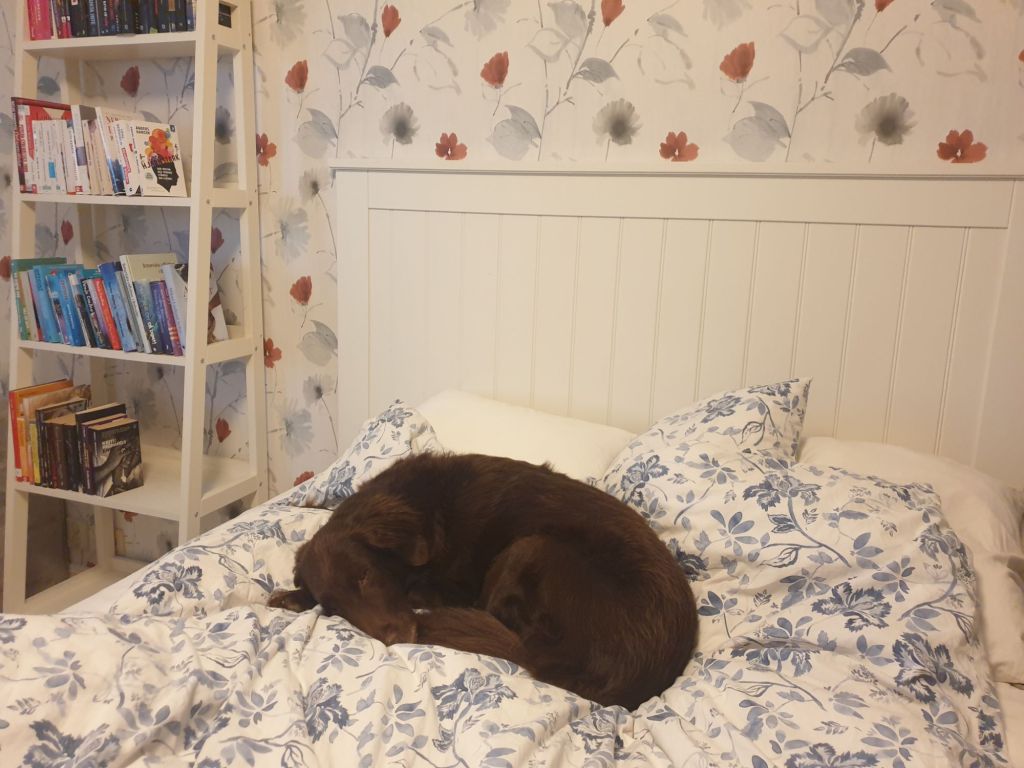 Mina hundar sover självklart i min säng om natten, men vi har haft som regel att det bara är tillåtet just på natten. Dum regel, tycker Delfi som nu har bestämt att det inte gäller seniora flattetanter…