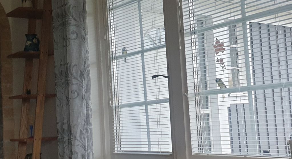 Men nu är de inte nöjda med det…! Nej, de sitter fortfarande på mina fönster – trots välfyllda fågelmatare – och dörrkransen har jag plockat ner, för fåglarna satt helt sonika och rev och slet i eternellblommorna. Ligister!