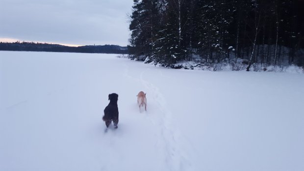 Tidigare på dagen kunde Piaf, Delfi och jag gå en ordentlig runda – man välkomnar verkligen hjulspåren att gå i under den största delen av rundan – medan Femma sov middag i canvasburen hemma.