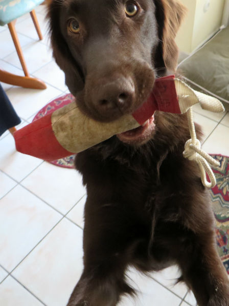 Här hemma, däremot, höll hon dummyn fint. Hon levererade den i hand. Sedan började hon spontanleverera leksaker på löpande band, genom att klättra upp på mig och lämna i brösthöjd – väldigt fint, tycker jag. Och ja, jag vet att jag kommer att ångra det jag gjorde sedan en och annan gång (när man har lite ömtåligare kläder och vädret inte är av det gynnsammare slaget), men det får jag ta då! Jag kommer säkert att komma ihåg anledningen. För även om hon inte kunde hon leverera dummies på samma sätt till att börja med, så ändrade vi på det…