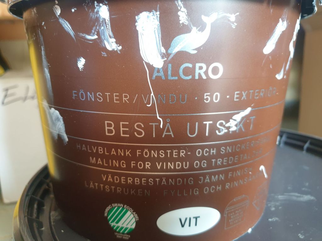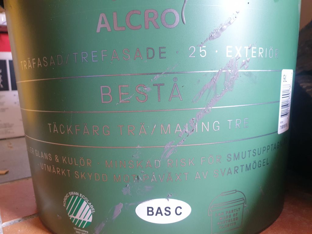 I huspärmen hade tidigare ägare lämnat uppgift om husets färg, en Alcro färg, som jag kunde konstatera får de bästa betygen i olika färgtester. Det är inte många som får så fina betyg – tvärtom – men Alcro, Falu vapen och någon till låg i topp. Skulle tro att det är därför jag kunnat vänta så länge med att måla om huset…….