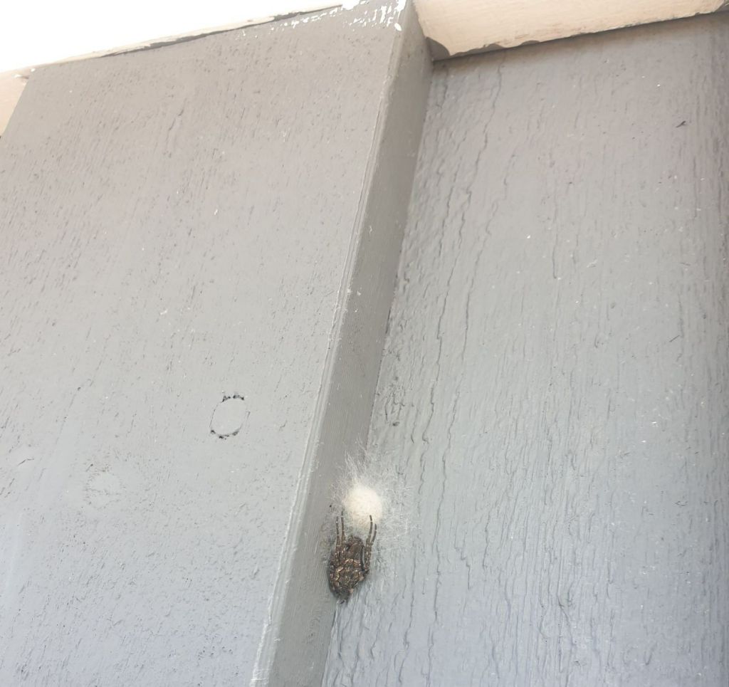 Spindel (sort?) hade parkerat sig och sitt ägg mitt på en fasad… Jag flyttade dem enligt alla konstens regler, hoppas det gick bra för dem.
