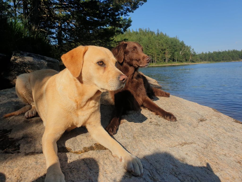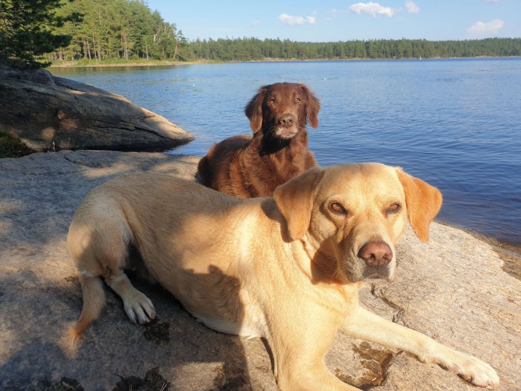 Så nu cyklar jag ner till sjön – utan hund!!! – och tar mina långa simturer. Sedan går jag ner med hundarna och badar lite lagom med dem. Hundarna verkar förresten uppskatta torkningen efteråt mer än själva badandet…